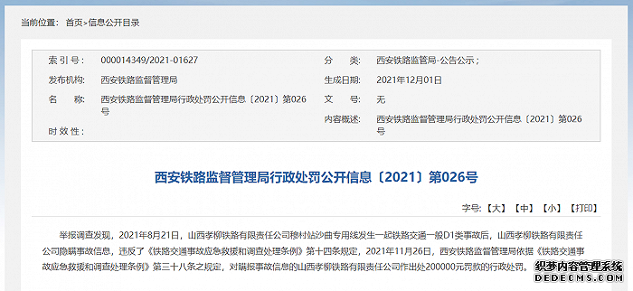 ???舉報調(diào)查發(fā)現(xiàn),2021年8月21日,山西孝柳鐵路有限責(zé)任公司穆村站沙曲專用線發(fā)生一起鐵路交通一般D1類事故后,山西孝柳鐵路有限責(zé)任公司隱瞞事故信息,違反了《鐵路交通事故應(yīng)急救援和調(diào)查處理條例》第十四條規(guī)定,2021年11月26日,西安鐵路監(jiān)督管理局依據(jù)《鐵路交通事故應(yīng)急救援和調(diào)查處理條例》第三十八條之規(guī)定,對瞞報事故信息的山西孝柳鐵路有限責(zé)任公司作出處200000元罰款的行政處罰。