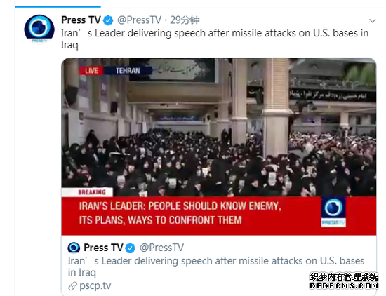 ???在伊朗空襲美國駐伊拉克軍事基地后,伊朗最高領(lǐng)袖哈梅內(nèi)伊8日發(fā)表講話。在講話中,哈梅內(nèi)伊表示美國在該區(qū)域(中東)的存在必須終結(jié)。 哈梅內(nèi)伊在講話中首先稱贊了遭美國殺害的伊朗伊斯蘭革命衛(wèi)隊高級指揮官蘇萊曼尼。 隨后,哈梅內(nèi)伊還談及今晨伊朗空襲美軍基地一事,他表示,這次空襲“只是一記耳光”。 此外,哈梅內(nèi)伊表示,蘇萊曼尼挫敗了美國在伊拉克和阿富汗的陰謀。